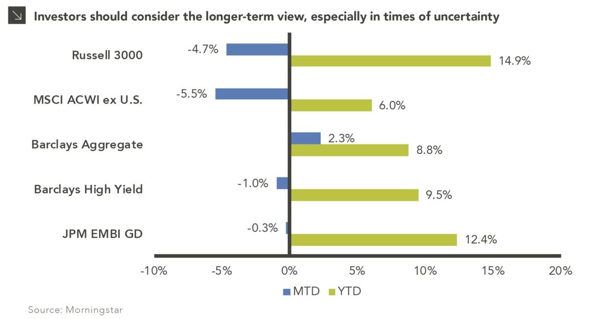 Given this week’s volatility driven by (brief) yield curve inversion, the ongoing U.S.-China trade dispute, disappointing economic data from Germany, and overall growing pessimism about future growth, investors’ growing concerns about portfolio returns are entirely justified. However, despite this week’s volatility and mostly negative news, almost all asset classes have delivered positive returns for the year, with the great majority of U.S. equity strategies up double digits. Furthermore, most fixed income strategies have profited from falling interest rates, as shown by positive returns from investment grade as well as below investment grade sectors. And for all the negative news out of the Eurozone and China, international equities — as represented by the ACWI ex-US index — are still up more than 6% through August 15th. While the rest of the year is likely to feature elevated volatility and lower returns, barring a major market correction most portfolios should remain in positive territory, despite what has transpired the first half of August. If nothing else, we encourage investors to take a long-term view of the markets and not overreact in times of market stress, as stepping back and taking a longer-term view of the markets indicates that 2019 has been a profitable year to date.