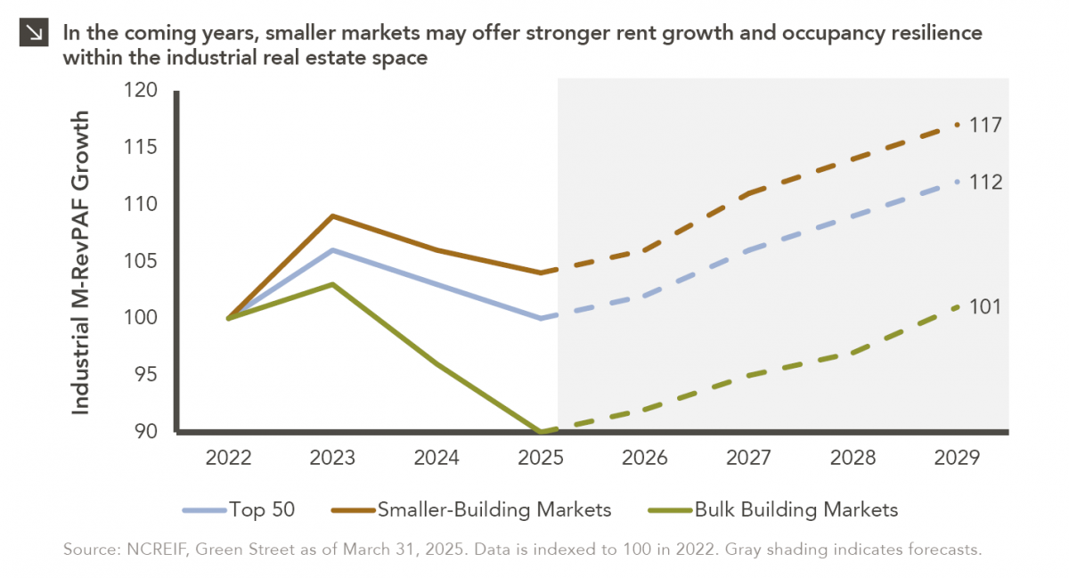 This week’s chart compares realized and expected Market Revenue per Available Foot (“M-RevPAF”) growth within the industrial real estate space…