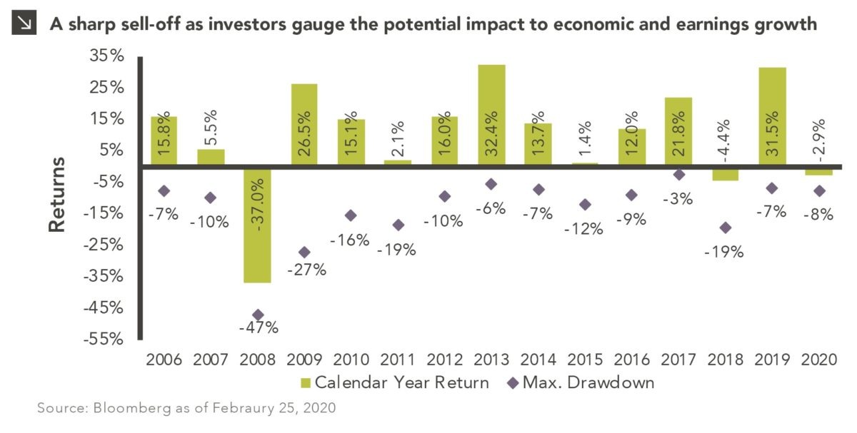 This week’s chart shows calendar year returns for the S&P 500 along with the max drawdown that occurred in each respective year. As of February 25, 2020, the S&P 500 has recorded a year-to-date drawdown of 7.6%. The current pullback is undeniably sharp in nature, but it is important to maintain perspective during turbulent times. Over the past 15 years, the average annual max drawdown was 14%. Many years experienced drawdowns near this level, yet still yielded a positive return for the year. On average, equities see a 5% pullback four times per year, a 10% pullback once per year, and a 20% correction once every five years.