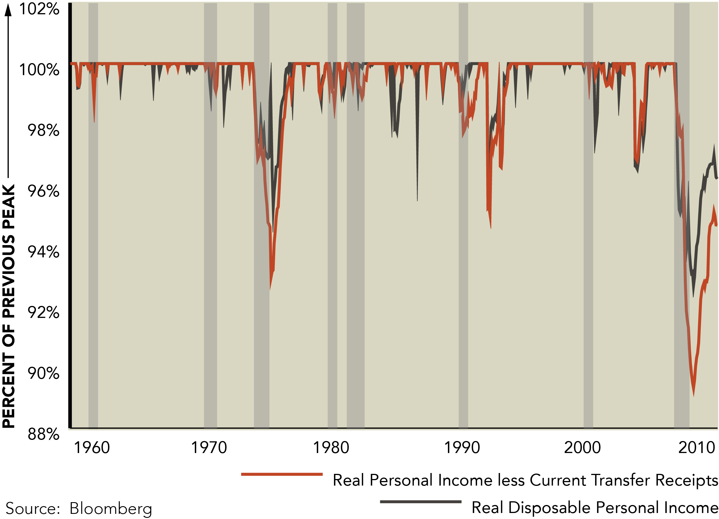 This chart looks at the drop and recovery in real personal income during recessions over the last 50 years (personal income is shown as a percentage of the previous peak to look at prior recessions on an apples-to-apples basis). The red line (Real Personal Income less Current Transfer Receipts) shows inflation adjusted after-tax disposable income not including government support (i.e. net social security receipts, unemployment insurance, etc.). The gray line (Real Disposable Income) shows inflation adjusted after-tax disposable income including government support.