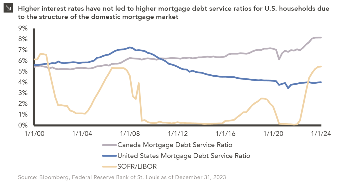 As a result of these dynamics, the U.S. household mortgage debt service ratio — which is the ratio of monthly mortgage principal and interest payments to disposable household income — has remained low, so more disposable income is available to Americans relative to individuals in other parts of the developed world. Indeed, the ability to lock in fixed rates on mortgage loans at terms of 20 or 30 years is somewhat unique to the United States in a way that is often overlooked. Canadian households, for instance, are already feeling pain from higher interest rates, evidenced by the recent increase in the nation’s mortgage debt service ratio relative to that of the U.S. To that point, Canada has shorter available mortgage terms from traditional lenders, with a maximum of five years prior to refinancing in most cases. This has left many Canadians grappling with the impact of higher rates, as most possess either fixed-rate mortgages with short-term resets or those with variable rates.