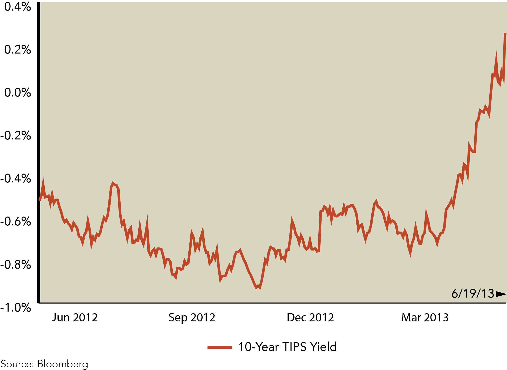 This week’s Chart of the Week illustrates the significant increase in yields on the 10 Year Treasury Inflation Protected Security (TIPS) over the past several weeks. From May 1, 2013 to June 19, 2013, the yield on 10 Year TIPS increased from -0.67% to +0.26% (an increase of 0.93%). Over that time frame, investors holding 10 Year TIPS contracts suffered losses of approximately 8.0% (there is an inverse relationship between prices and yields, so as yields increase, prices fall). This huge selloff in TIPS has largely been driven by the increase in yields on the 10 Year Nominal Treasury, which saw yields jump by 0.72% over the same time period (representing a loss of 4.9%). Much of the increase in the 10 Year Nominal Treasury yield has been attributed to expectations that the Federal Reserve Bank, which is currently purchasing $85 billion worth of Treasuries and Mortgage Backed Securities every month as part of its various quantitative easing programs, is going to start winding down its asset purchases in the near future. This was confirmed on June 19, when Federal Reserve Chairman Ben Bernanke announced that if economic data continues to come in line with the Fed’s current expectations, the Fed will begin to scale back the level of asset purchases later this year, and could end the asset purchases entirely by mid-year 2014.